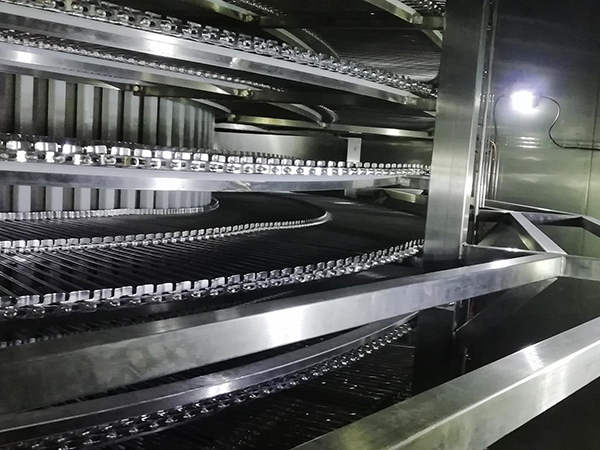 صممت وصنعت بواسطة شركة MOON-TECH، وتتيح بنية السير الشبكي الحلزوني نقل المنتجات بسلاسة وتحكم مع تقليل الصدمات الميكانيكية إلى أدنى حد. هذا التصميم مناسب بشكل خاص للتعامل مع المنتجات الحساسة في بيئات المعالجة الباردة.